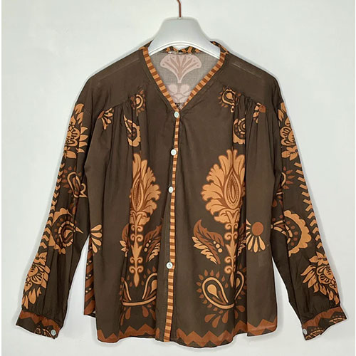Blusa estampada con botones hasta abajo y canesu fruncido. Manga larga.