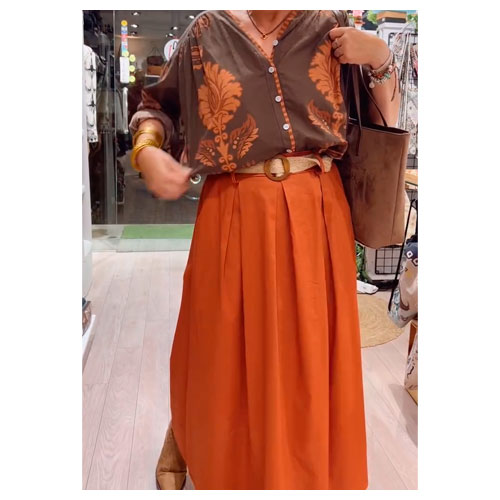 Falda midi de mujer. Cinturilla elástica trasera. Bolsillos laterales. Trabillas para cinturón incorporado. Adaptable de la talla 36 a la 44. Composición: 95% algodón y 5% elastano.